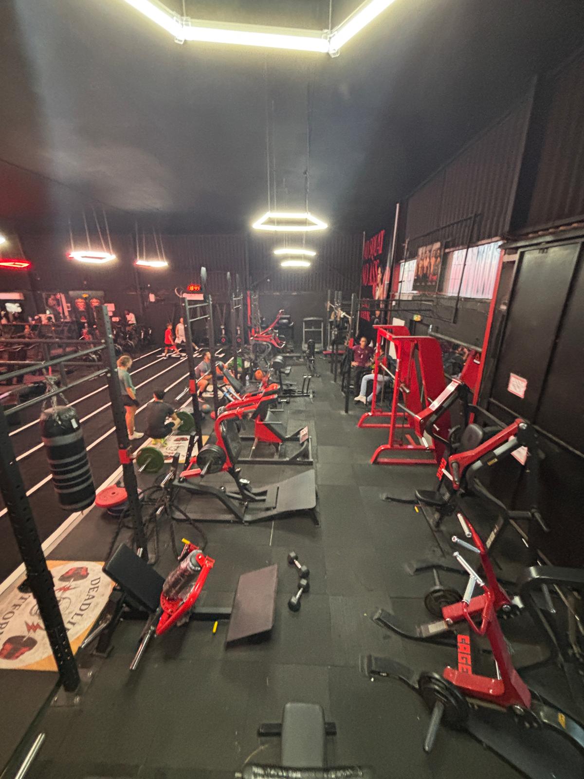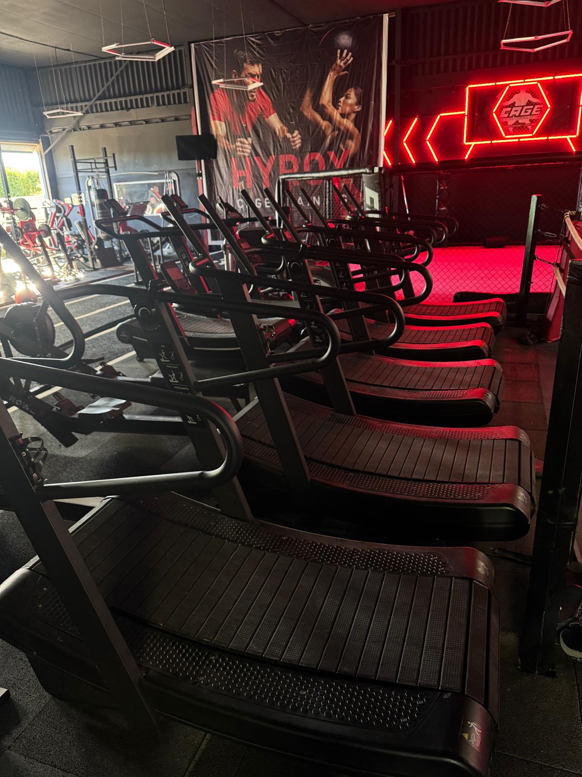 Haltéro, cardio, sacs, ring, zone Hyrox, cage officielle, tapis de course.