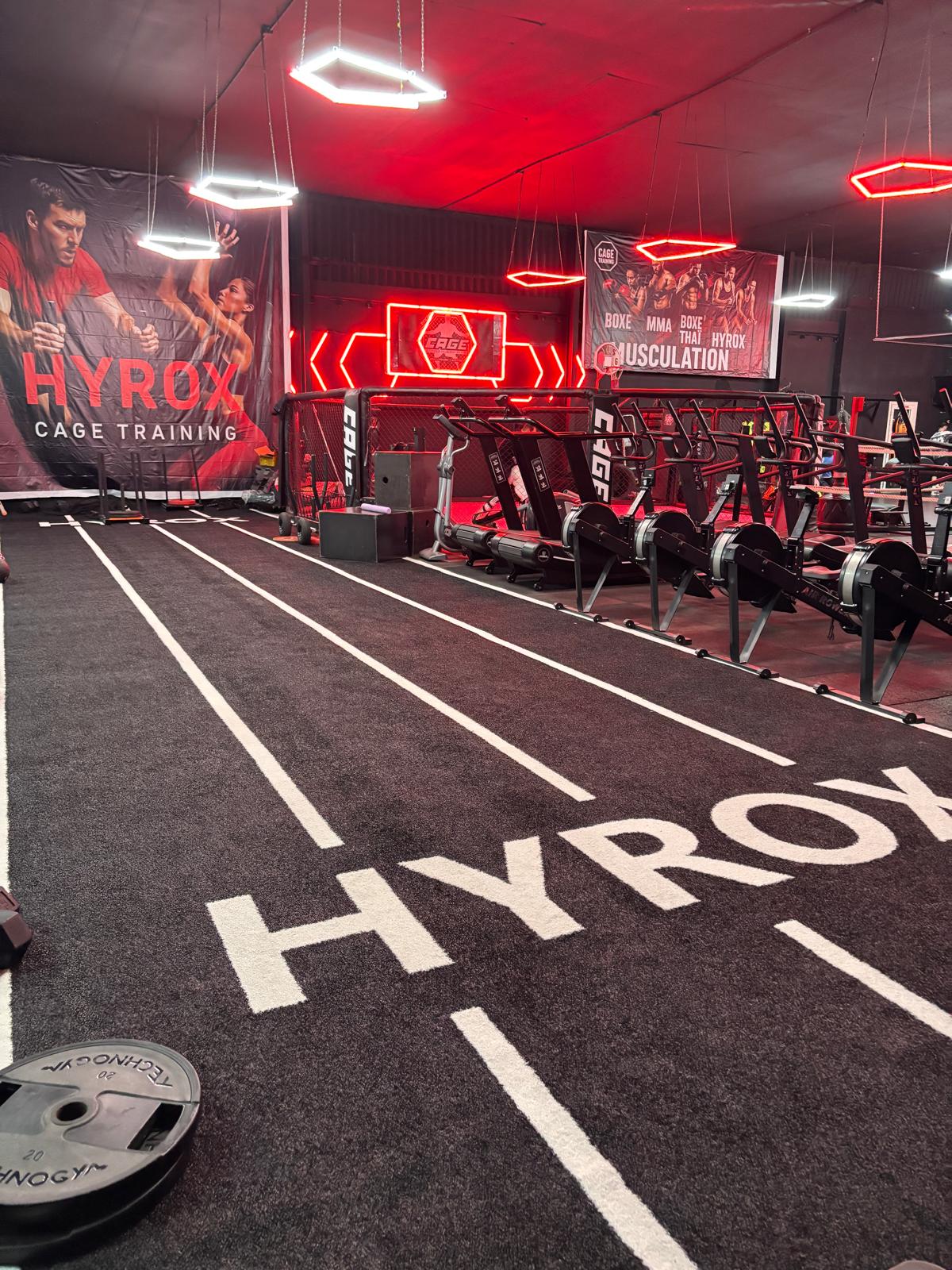 Haltéro, cardio, sacs, ring, zone Hyrox, cage officielle, tapis de course.